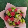 Puokštė „Įvairumas“ sukurta iš rožių, gipsomų, gvazdikų, gerberų bei žalumos ir supakuota į spalvotą dekoratyvinį popierių.
