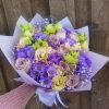 Didelės kompozicijos gėlių puokštė, kurią sudaro geltonos rožės, violetinės smulkios gėlytės ir gipsofilijos.
