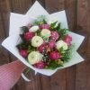 Puokštė pagaminta iš labai gražių spalvų, kurios tarpusavyje sudaro nuostabų vaizdą. Įterptos kompozicijoje yra ir švelnios violetinės spalvos rožės.