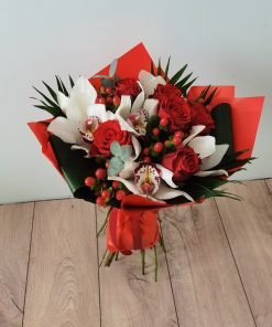 Puokštė „Žalioji“ sukurta iš rožių, orchidėjų, gvazdikų, uogyčių bei žalumos ir supakuota į spalvotą dekoratyvinį popierių.